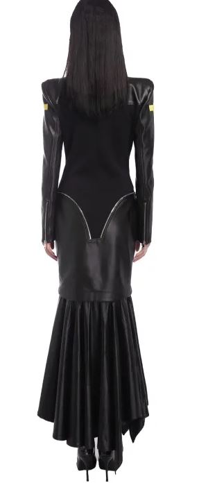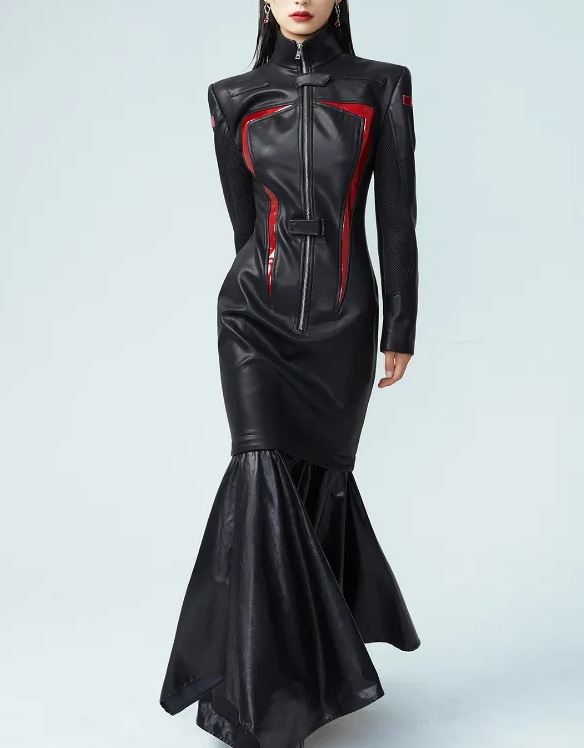 2N1 Red and Black Patchwork Faux Leather Maxi Dress with Detachable Hem