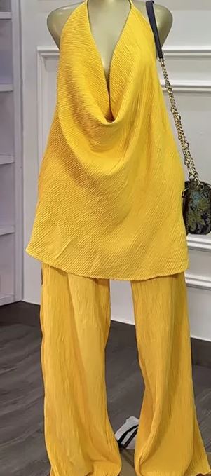 Deep V-neck Halter Top and Wide Leg Pants Suit